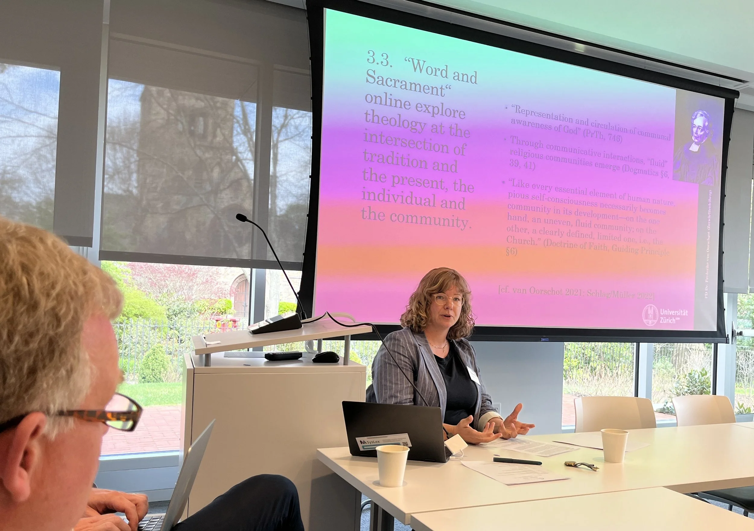 Frederike van Oorschot (Universities of Zurich and Heidelberg) broadened Greggs’ reflection by explicitly considering contemporary practices of faith, particularly in digital ecclesial contexts. Beginning with the classical Reformation claim that the church is marked by the preaching of the Word and the right administration of the sacraments, van Oorschot proposed an inductive approach to theology that starts from lived experience rather than abstract system. Utilizing categories of confession, community, and performance, she explored how online ecclesial practices may instantiate forms of Word and sacrament that challenge inherited assumptions about presence, mediation, and participation.